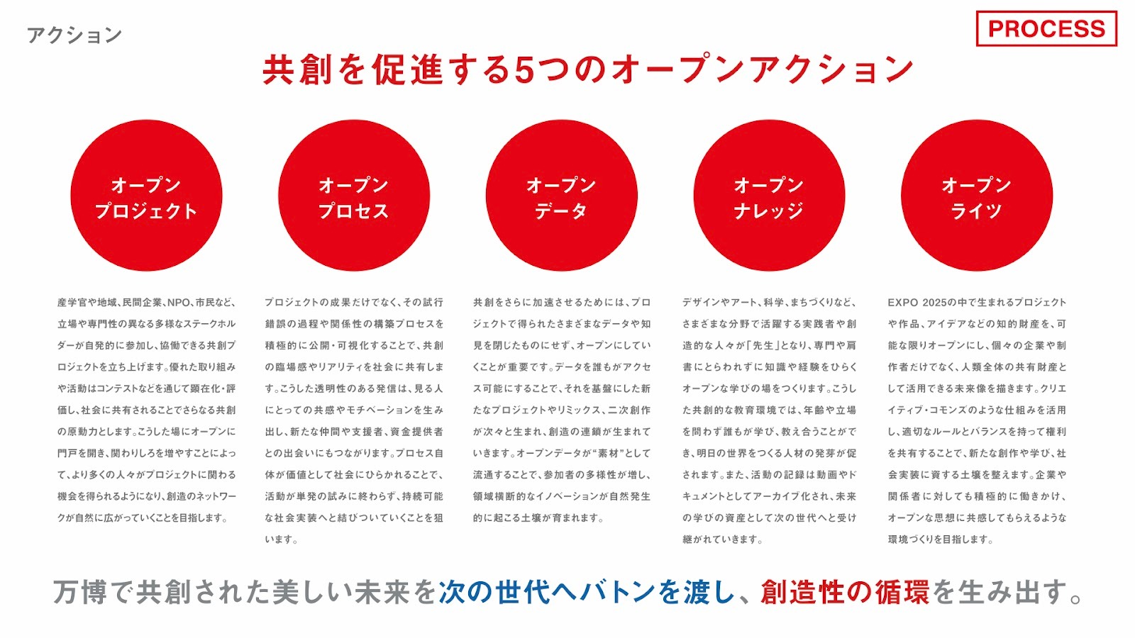 「ある意味でオリンピックの出来事に対するアンサーでした。ムーブメント、運動体にしていこうっていうのは、パラリンピックの多様性のある社会をつくっていこうという考え方からきているんです。企画書には、5つのオープンアクションって書いています。NPOも含めた地域の民間企業とか産学官民、一緒につくっていくようなオープンプロジェクト。プロセスを世の中に共有して可視化するオープンプロセス。メーカーズムーブメント的なデータを世の中に共有していくオープンデータ。万博に関わっているクリエイターが学んだ知見を世の中に共有して、若いクリエイターにもわかるようにするオープンナレッジ。最後がオープンライツで、クリエイティブコモンズ的なことも含めて、少し権利を緩くしてみんなに遊んでもらえるような仕組みをつくろう、と。それを次世代に渡して創造性の循環をつくっていこうっていう、これがエッセンシャルな企画です。デザインシステムの前段のトータルな企画ではあるんですよね。」
