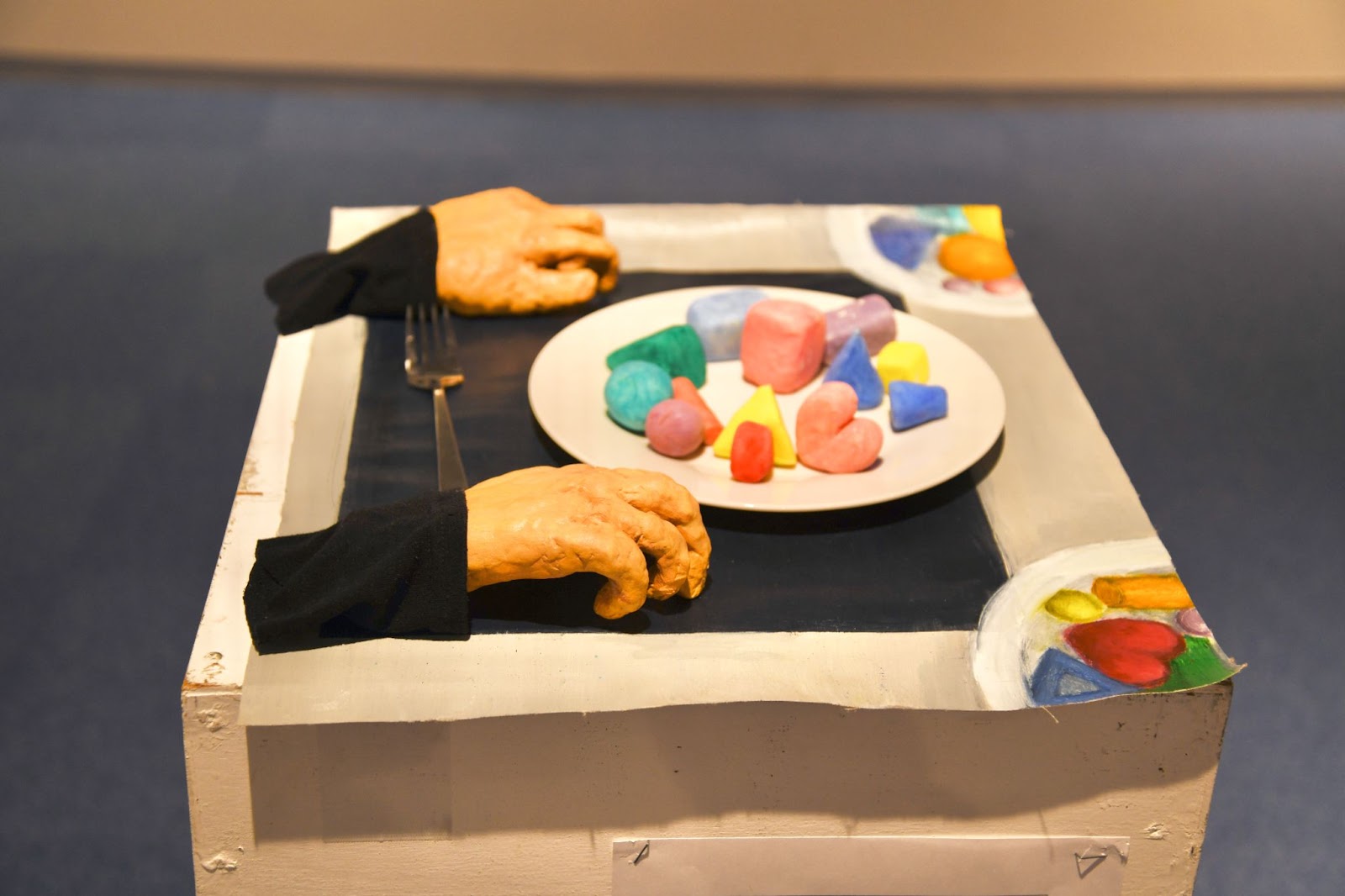 「この作品は、矛盾している感情について考えていて。自分の矛盾している感情が、他人ありきやなぁって思っていて、それで参加型にして、自分の感情(紙粘土の作品)を実際に持ってもらったりして、それで自分の考えていることを表せたらなぁって。紙粘土は本当は積み木でやろうとしていたんですけど、木は木の色があるので、自分で着色できる紙粘土がいいかなって思いました。そういう扱いやすさで紙粘土にしました。」